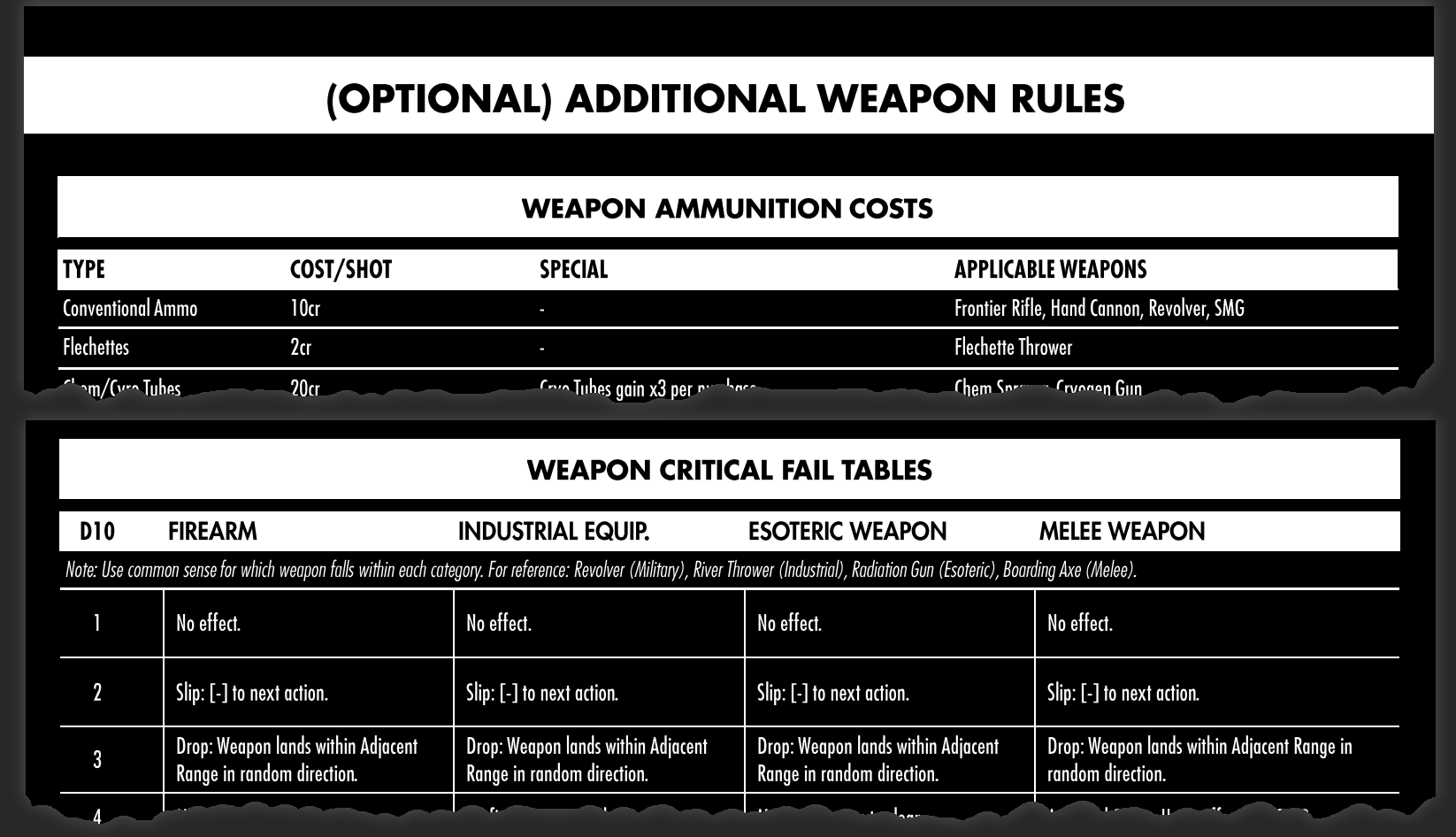 V2 now includes a table of 12 weapon attachments like a bayonet, extended capacity magazine, or underslung flamethrower, as well as optional rules for different weapon ammo costs, and a D10 table with consequences for Critical Fails while using a weapon.