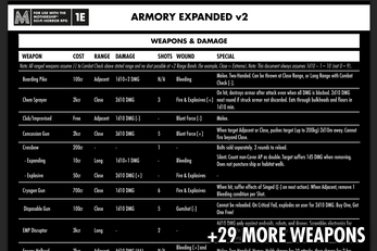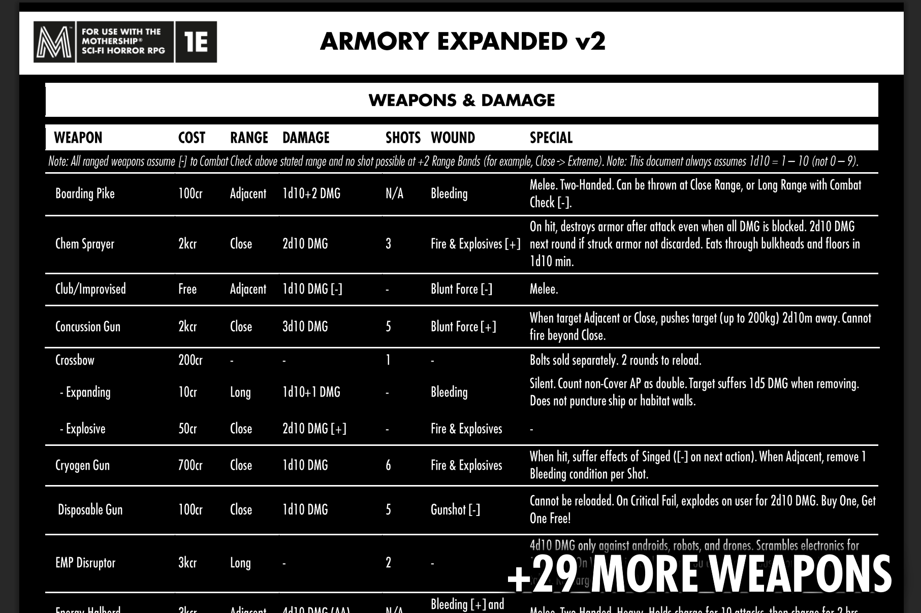 Armory Expanded is a compact, four-page table filled with weapons, armor, and equipment styled on those found in the Player's Survival Guide for Mothership TTPRG.